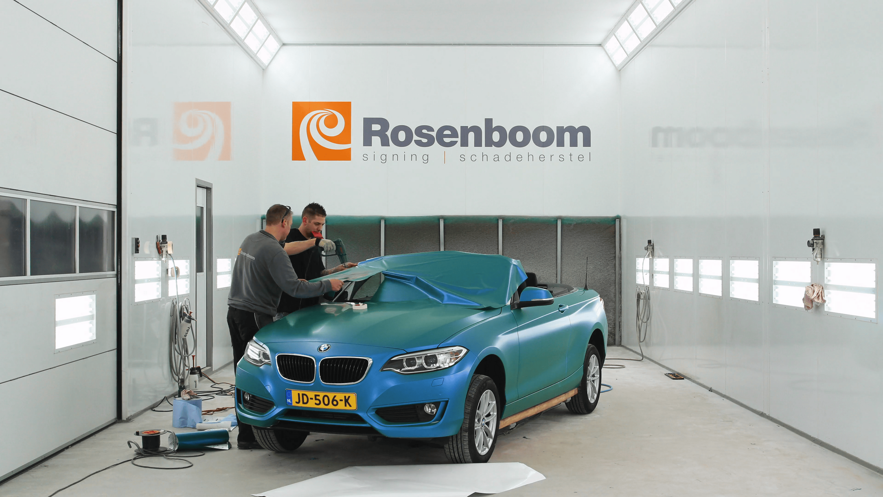 For Rosenboom Signing en Schadeherstel in Aalsmeer, I installed a camera and lens in the workshop for several days to create a time-lapse sequence. During that period, a white BMW was wrapped in blue-green foil.