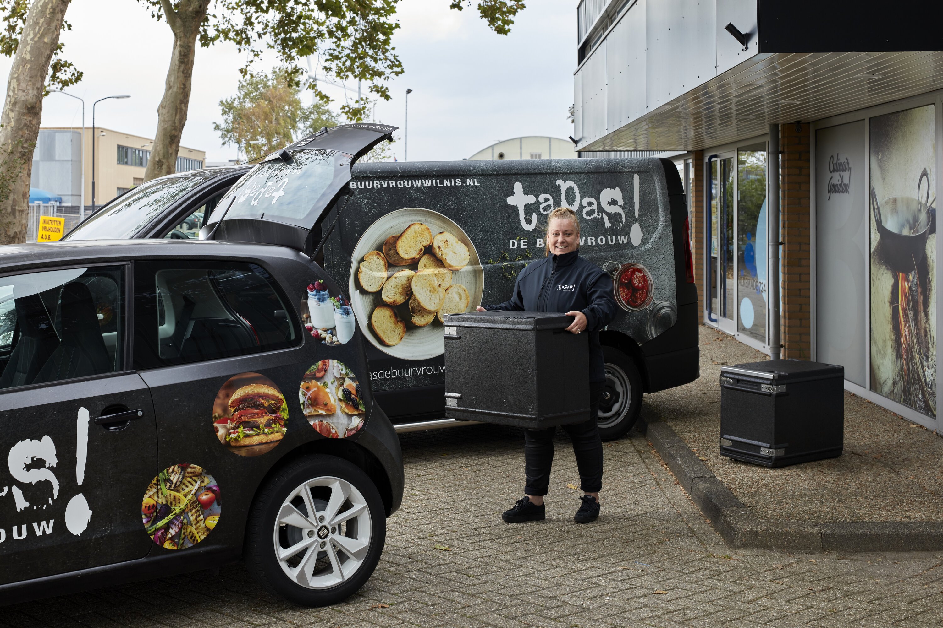 We felt this aspect deserved a bit more attention. For that reason, I created an image featuring the two company vehicles, Jessica, and the insulated food boxes in front of the current premises of Eten met de Buurvrouw.