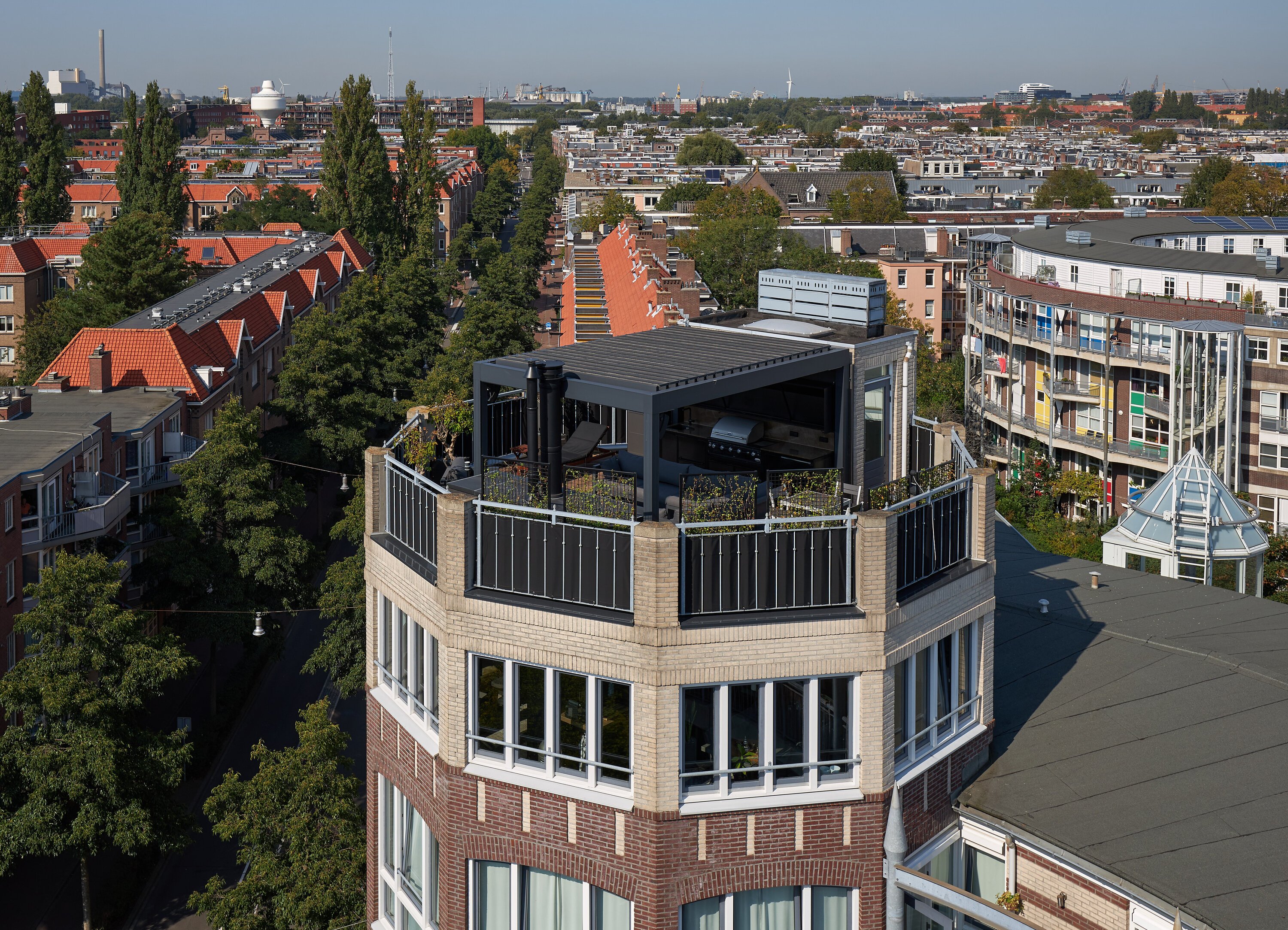 For Den Haan Bouw, I photographed a penthouse with a rooftop terrace in Amsterdam. Initially, the idea was to capture an image of the terrace using a drone, with the city as its backdrop. In this way, the surroundings become a powerful visual context within the photograph.