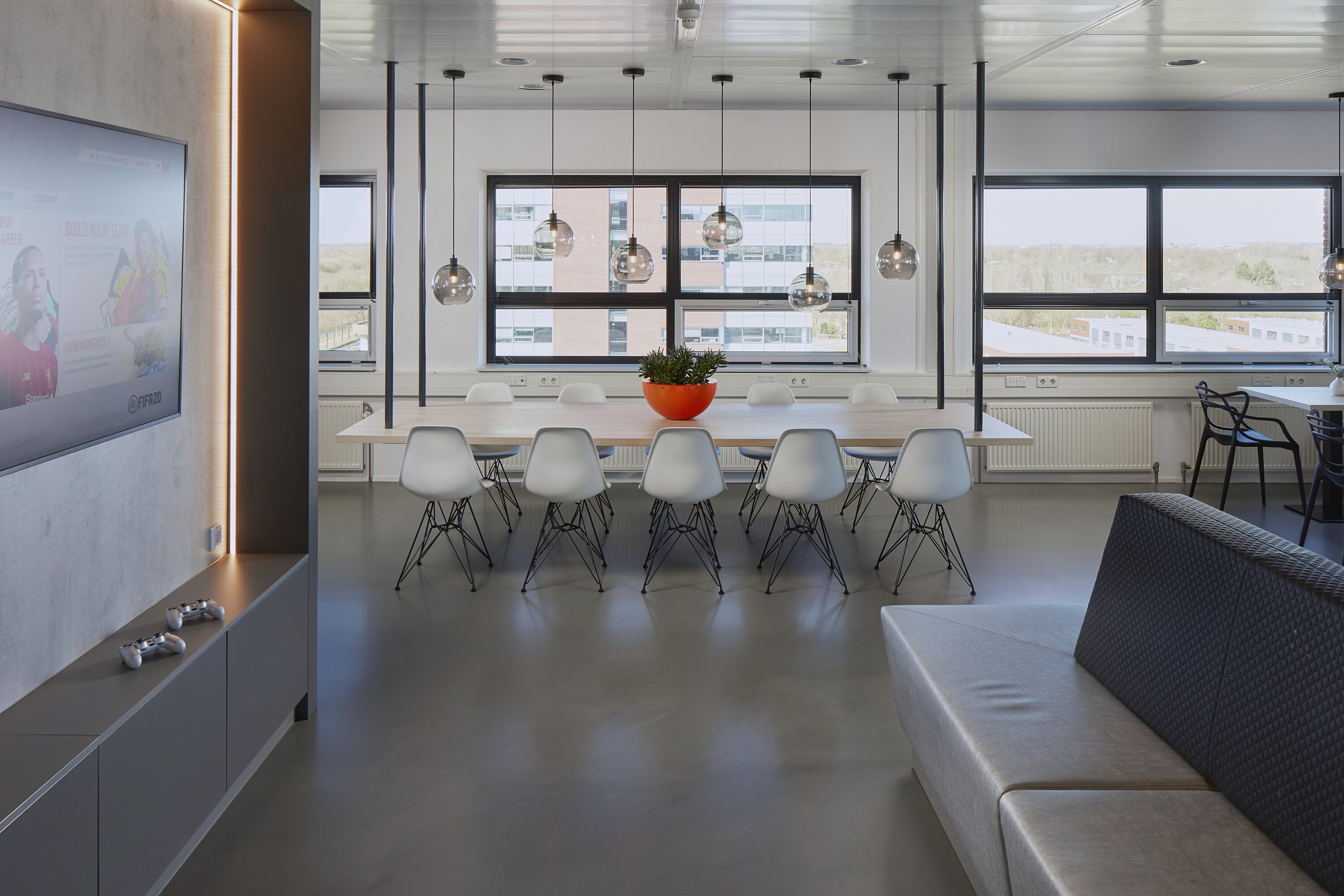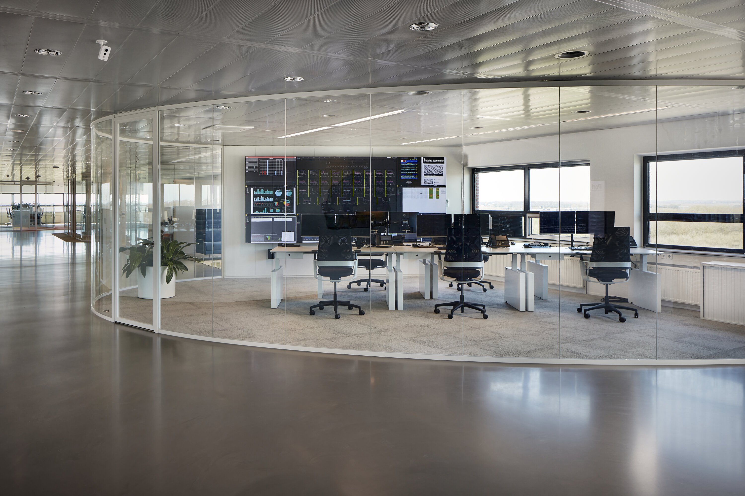 The company that commissioned the office operates within the aviation industry. The aviation theme is woven into the design in a variety of ways: acoustic fabrics and printed carpets, for example. Aircraft-style windows also reappear in the system walls. The largest—and for the company, most important—element is the control room, where systems continuously monitor the software they have developed.