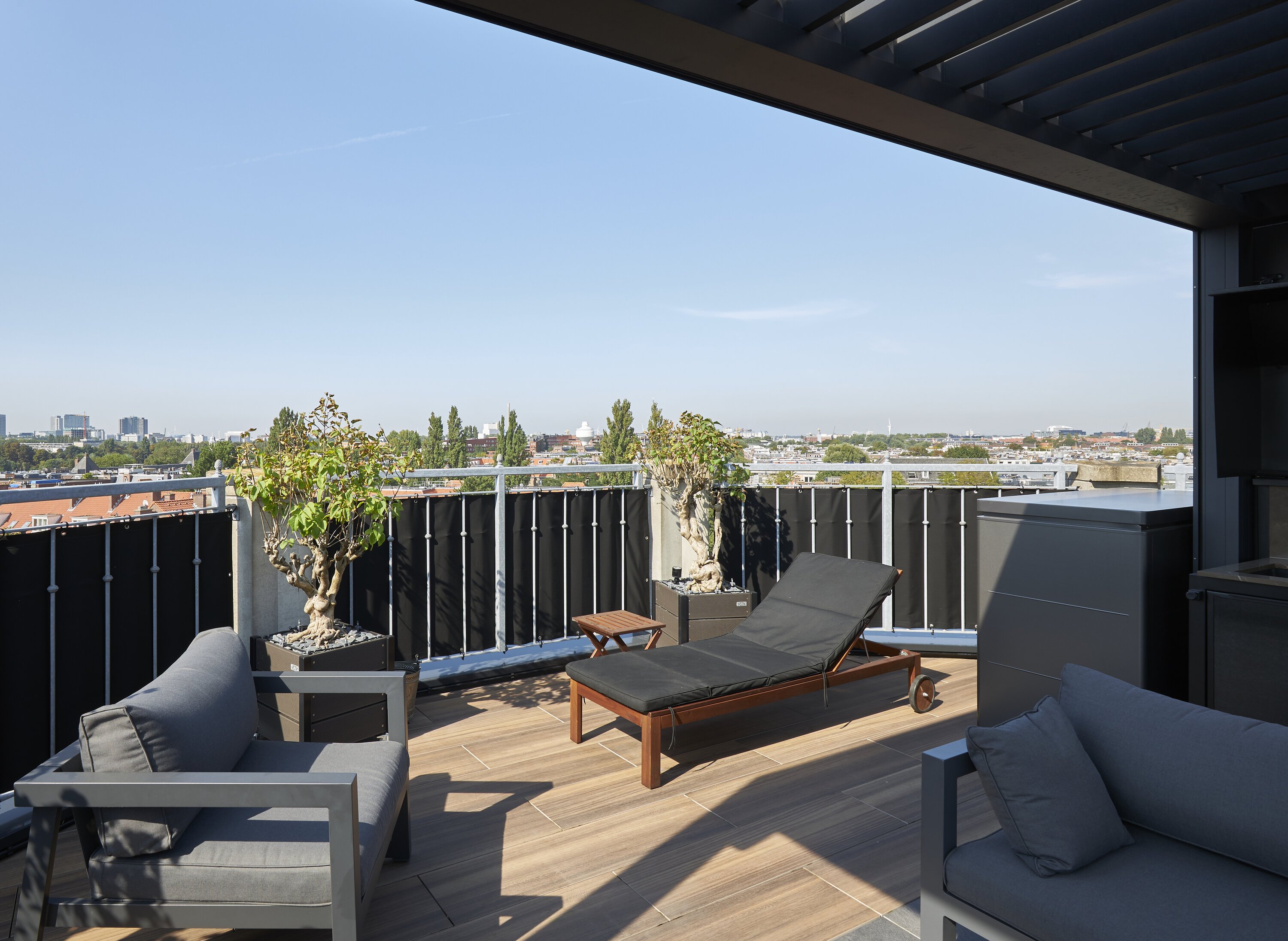 First, the rooftop terrace. Enjoying spectacular views over the city. Equipped with an outdoor kitchen, a shaded seating area, and an outdoor fireplace, it offers every comfort. The rooftop terrace, designed by ENZO Architecten, is a remarkable achievement in its own right.