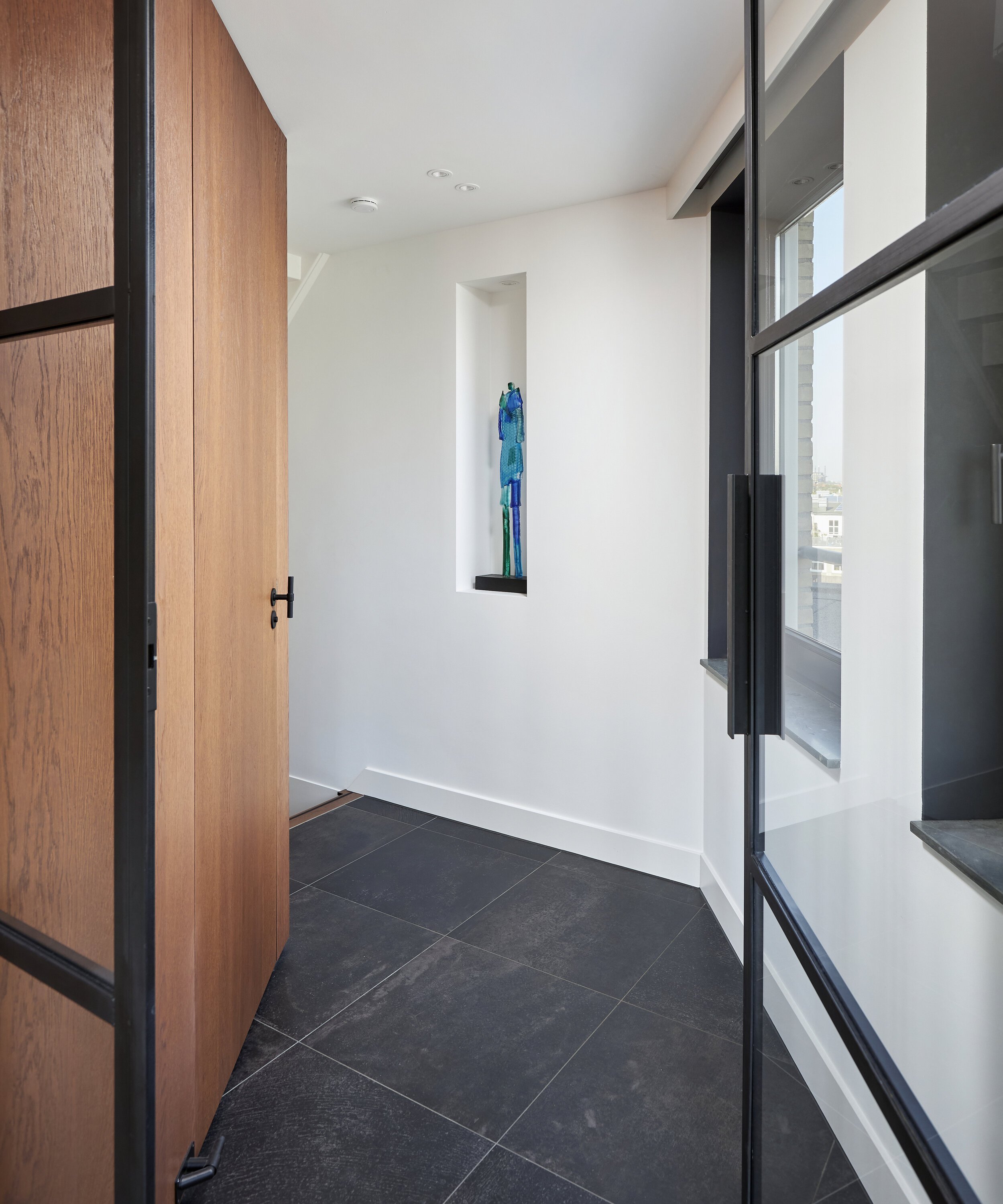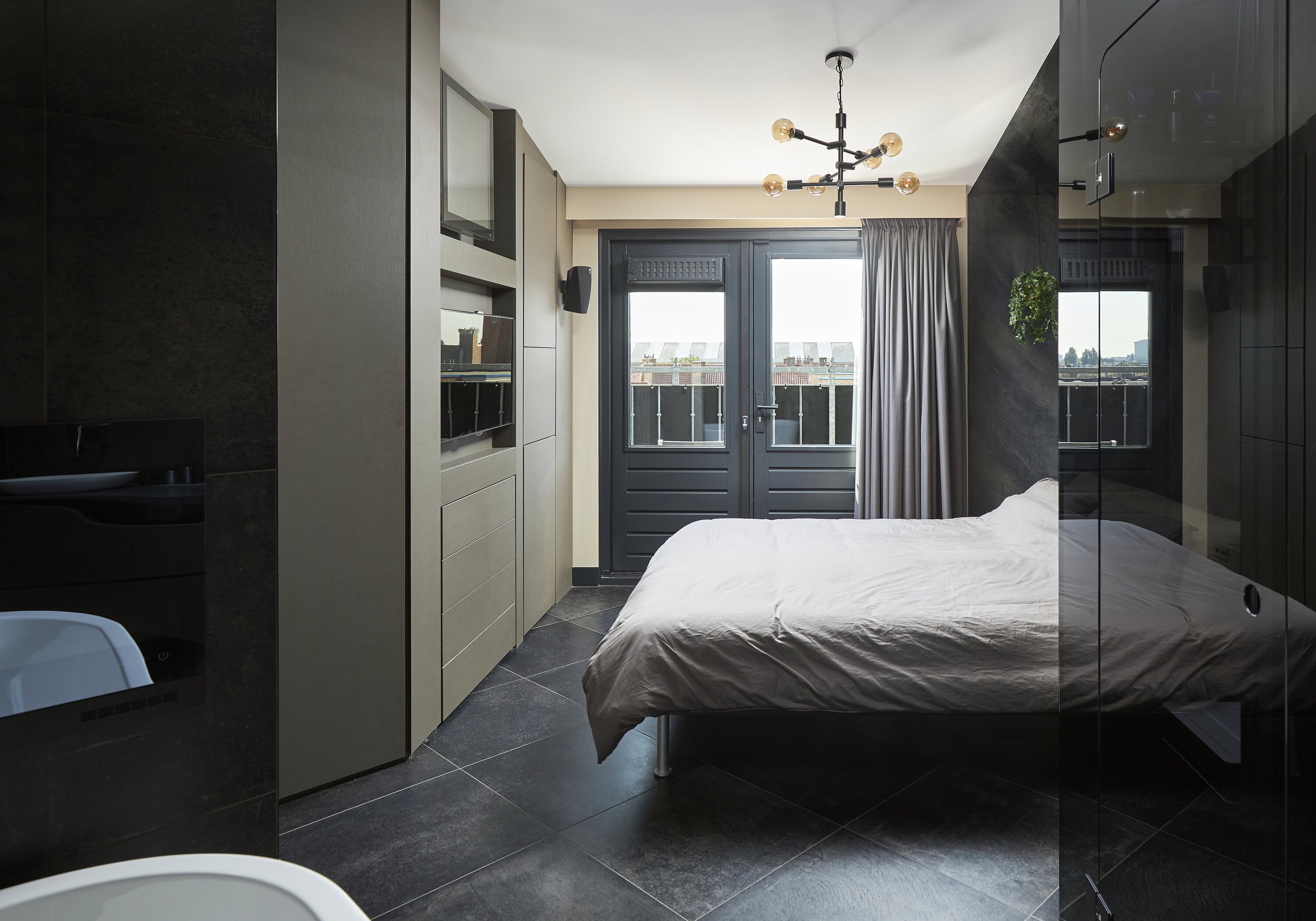 The penthouse was fitted with a bespoke kitchen by Heite Interieurbouw, featuring an appliance wall in smoked oak. The smoked oak extends seamlessly across the entire wall, continuing around the corner and incorporating the doors to the utility room, toilet, and meter cupboard.