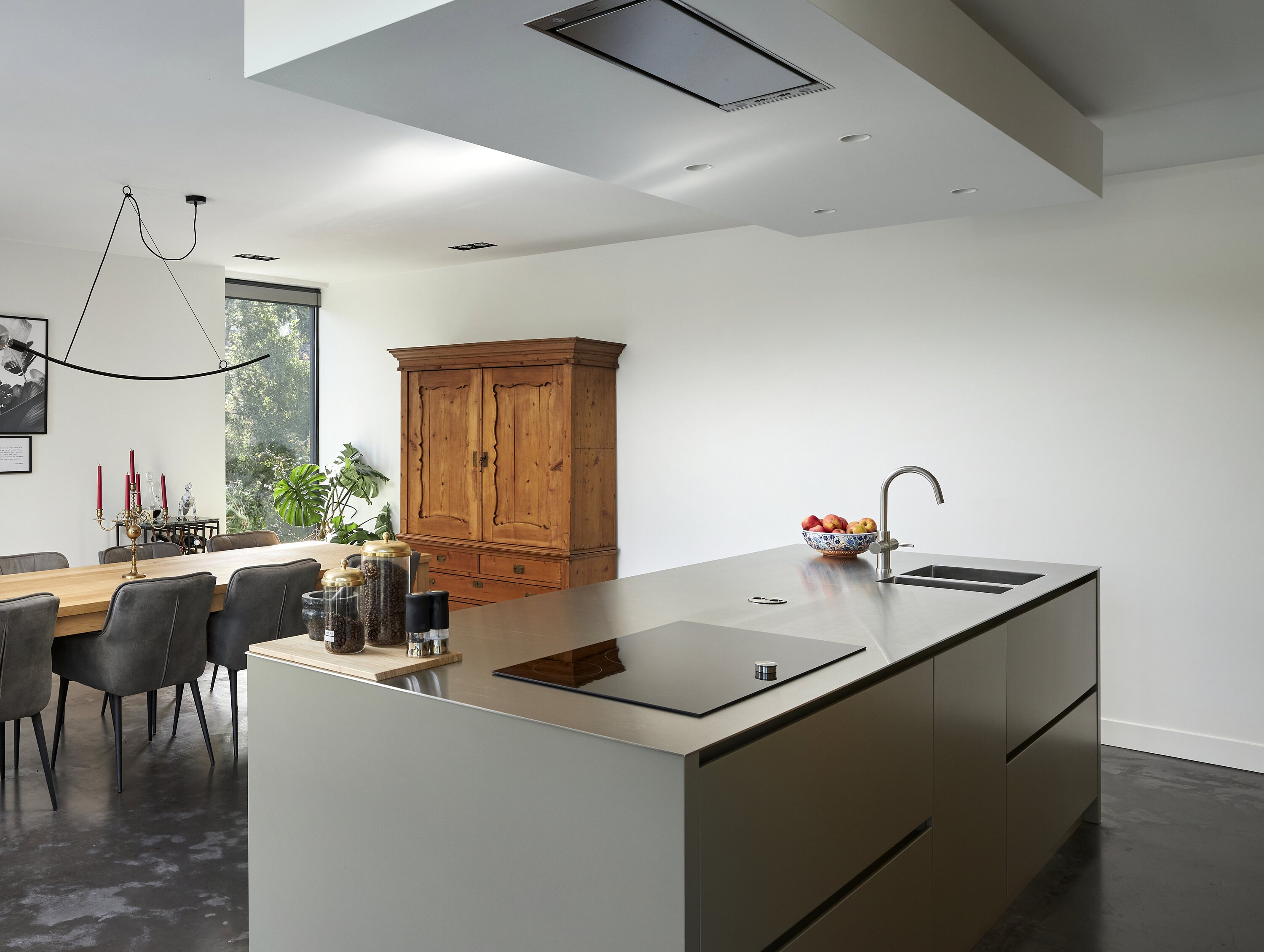The wooden panels in this kitchen create a warm atmosphere. Combined with sunlight and other wooden furniture, they result in a cohesive and inviting space. The built-in appliances and stainless steel worktop provide a strong contrast, giving the kitchen a clean, modern look. This suits the home well, especially in combination with the concrete poured floor.