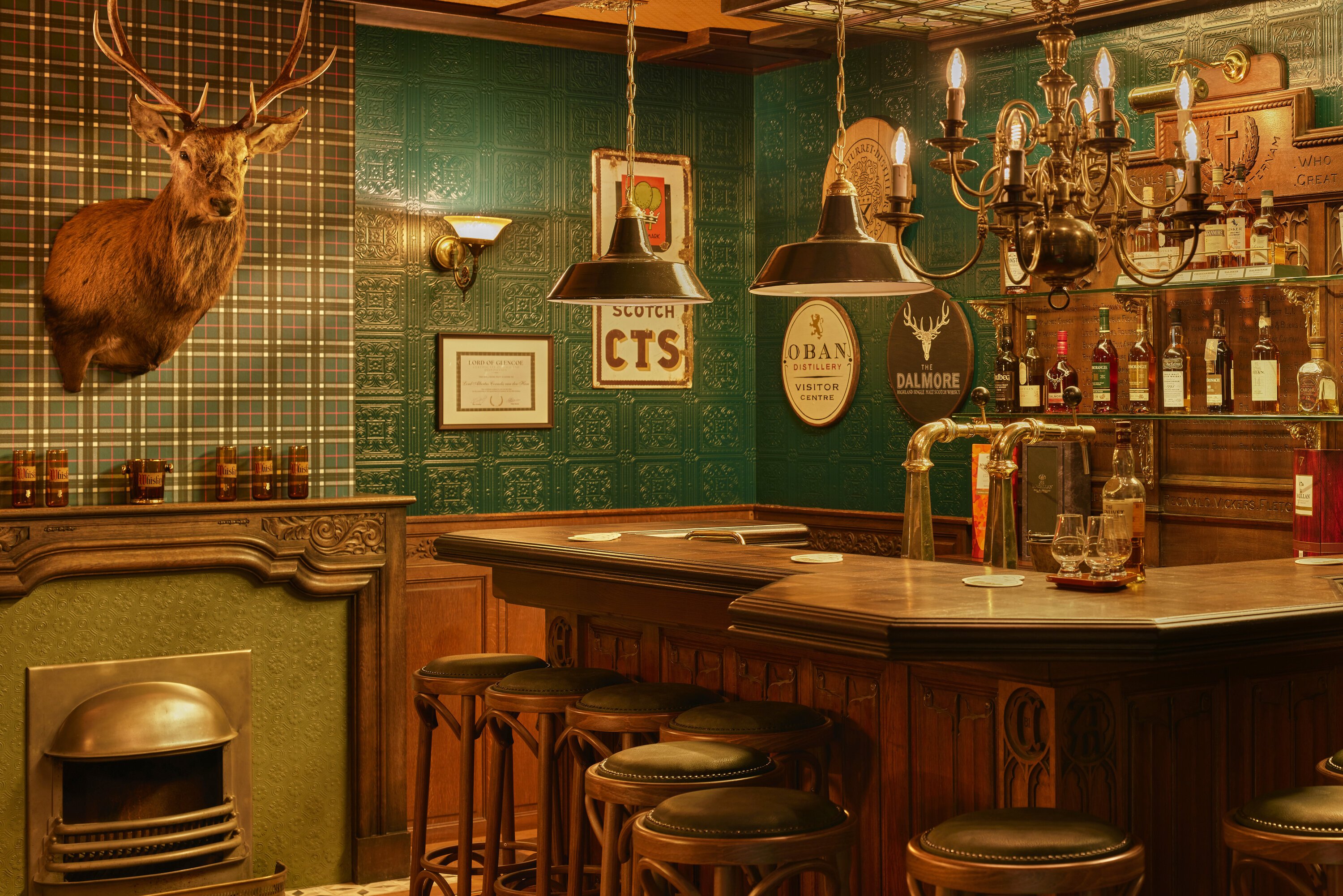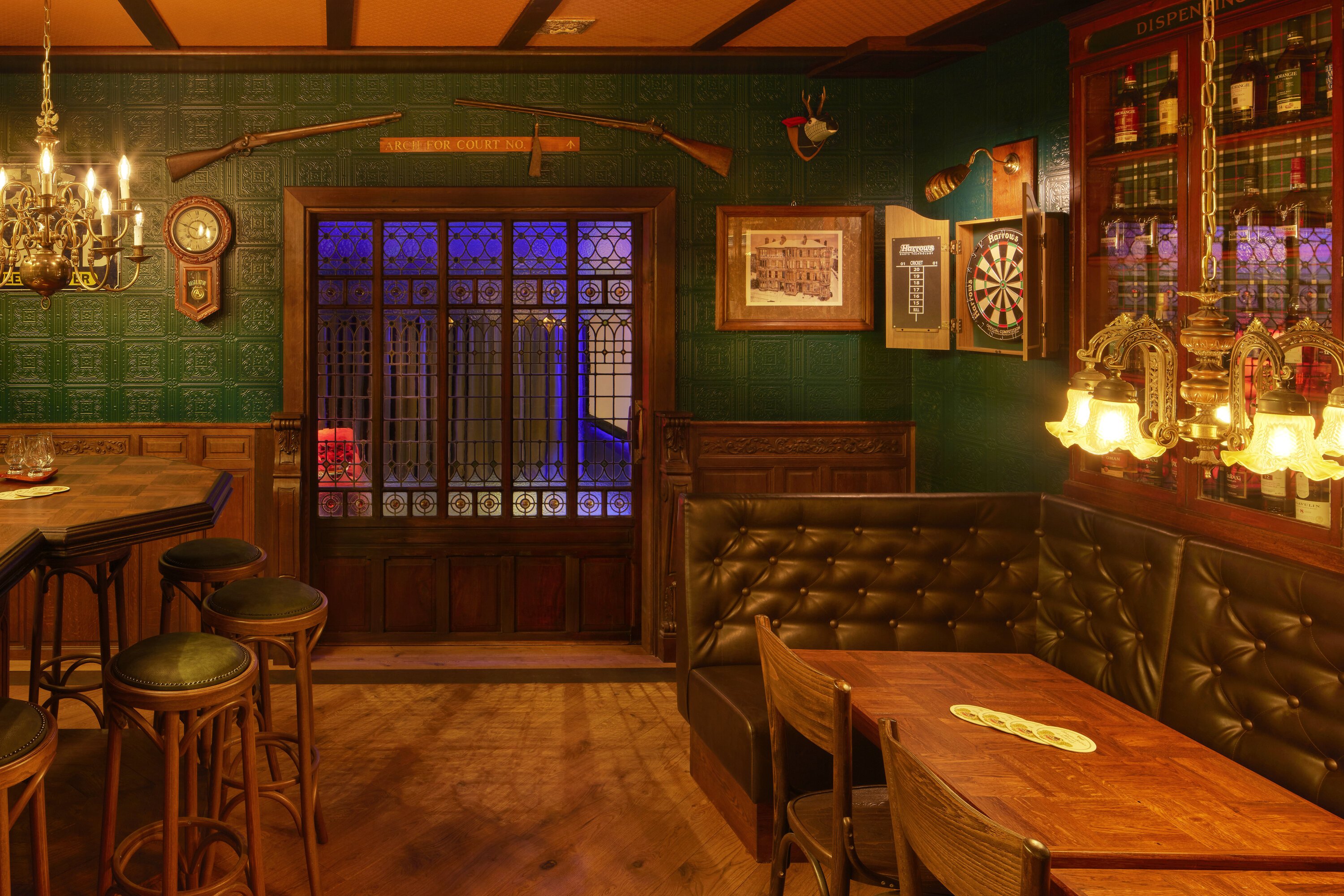 This pub feels complete and as though it has existed for years. Recently, the interior builder crafted the bar, back bar and whisky cabinet, as well as the fireplace, wainscoting, and wooden floor. Even an authentic entrance is part of the design.