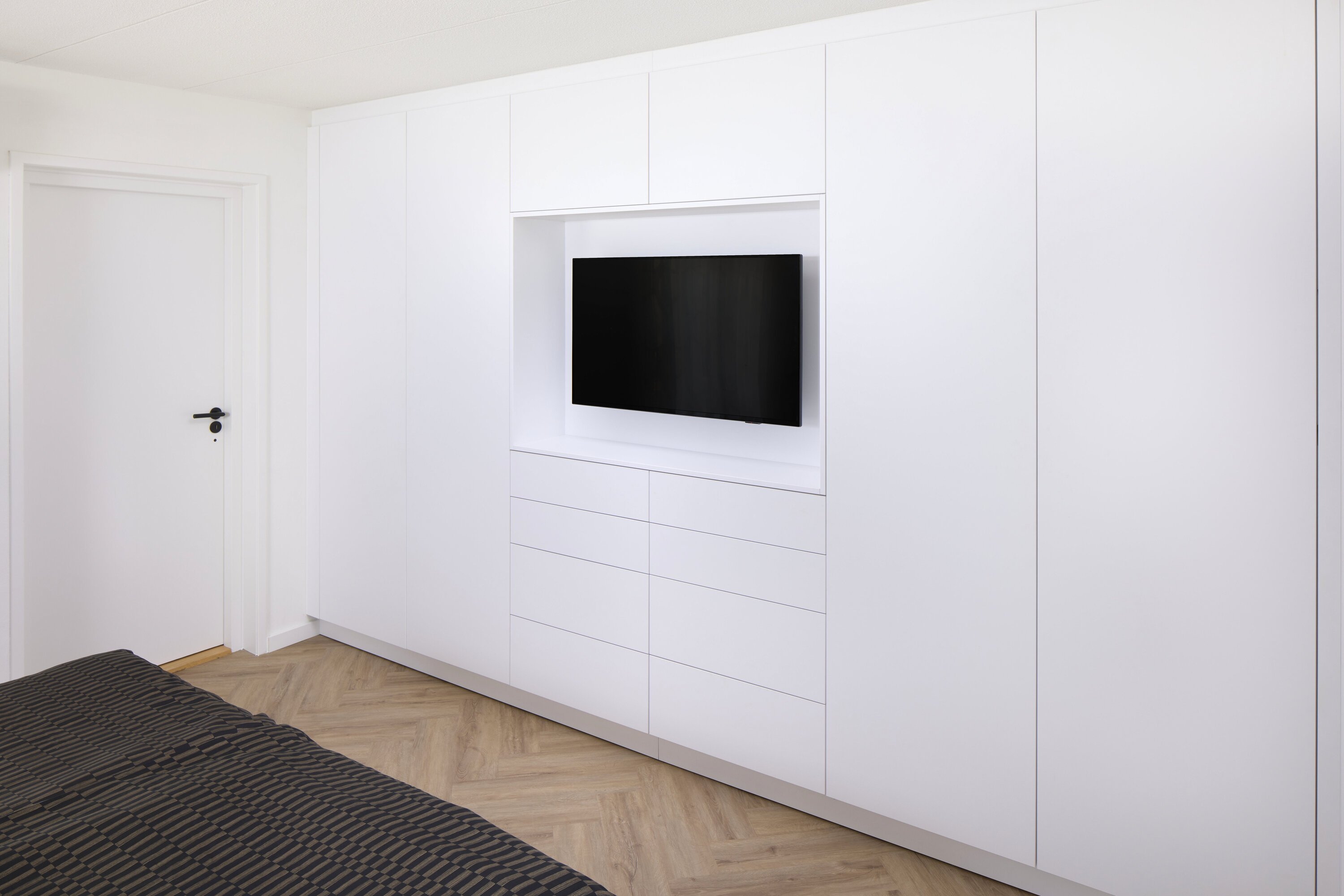At first glance, it’s not immediately clear where the doors, flaps, and drawers are located—and personally, I think that’s beautifully done. What’s also not very noticeable, yet highly practical, is how the cabinet has been built around a bulkhead. On the short side, the bulkhead has been boxed in, allowing its function to remain intact without detracting from the overall cabinet design.
