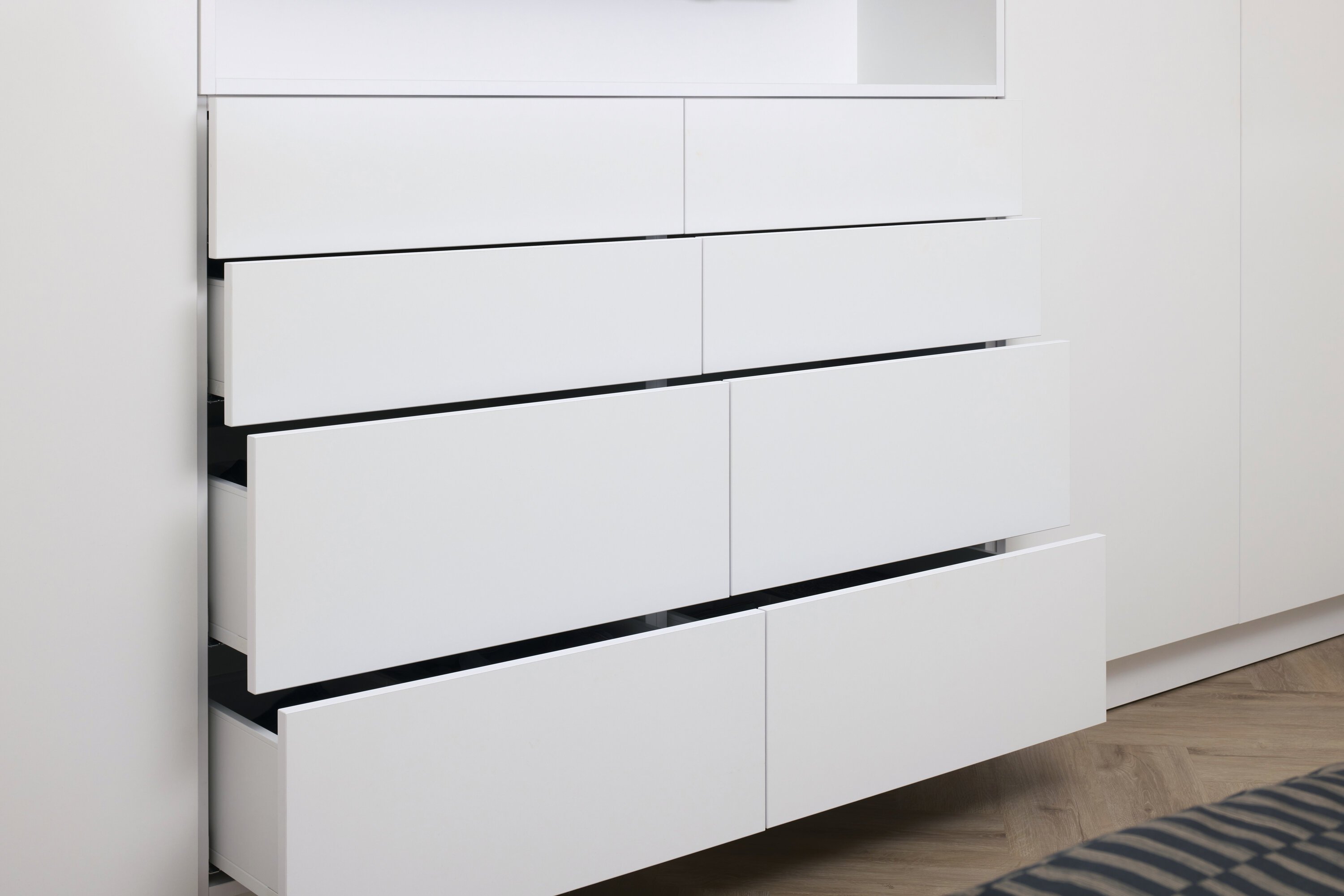 The wardrobe in this bedroom is designed to make optimal use of two walls. It has a clean, modern appearance, while incorporating several smart design solutions.