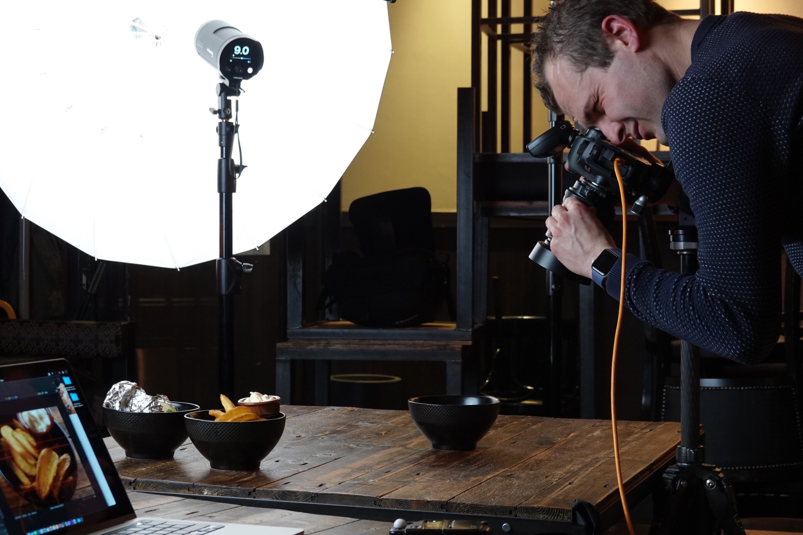 Studiolampen zijn gemaakt om te modificeren. Veel gebruikte hulpmiddelen zijn paraplus, softboxen, snoots, barn-doors en beauty dishes. Voor deze foto's gebruikte ik onder andere twee paraplu's met een diameter van 105 centimeter. De flitsers stonden op behoorlijk vermogen op een afstand van ongeveer 1 - 1,5 meter van tafel. Zet de flitsers met paraplu's dichterbij en de textuur wordt minder: want de lichtbron wordt groter. De lamp groeit natuurlijk niet echt, maar de afstand van de lichtbron beïnvloedt wel de hardheid van het licht. Het is een kwestie van smaak (haha) welke balans goed werkt voor aantrekkelijke foto's. Tijdens fotosessies beoordeel ik op mijn laptop en met een lichtmeter of het licht naar mijn zin is.