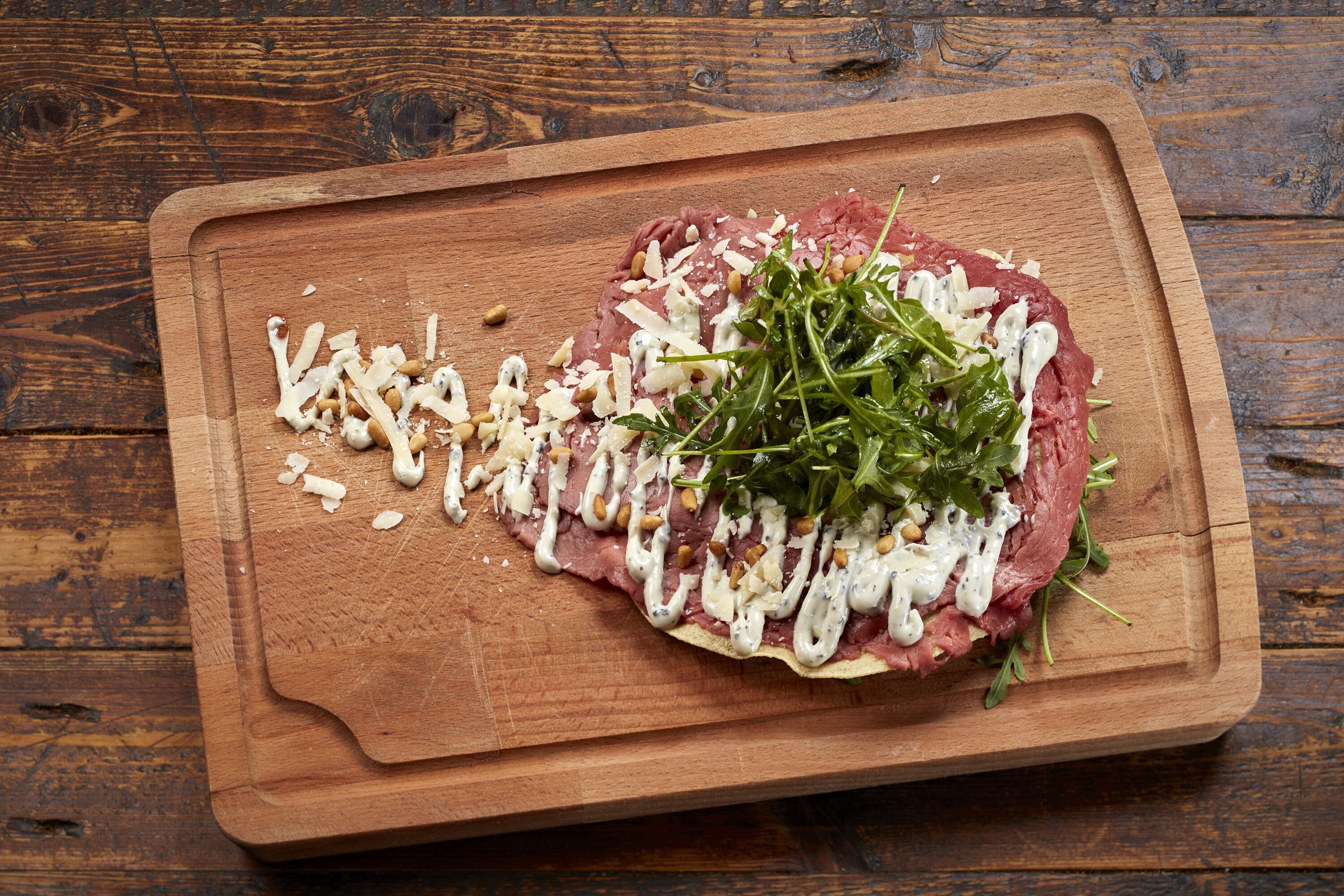 Ondersteunende lijnen maak ik zelf. Vaak begint de kijker onbewust op het lichtste deel van de foto, zoals ik in het begin beschreef. Vanaf daar zoek ik naar kijklijnen. Ik plaats gerechten met planken en servies zorgvuldig zodat ik de kijker rondjes laat draaien binnen de foto. Het doel is om de kijker in de foto te houden zonder dat deze per ongeluk uit beeld wordt 'gewezen.'