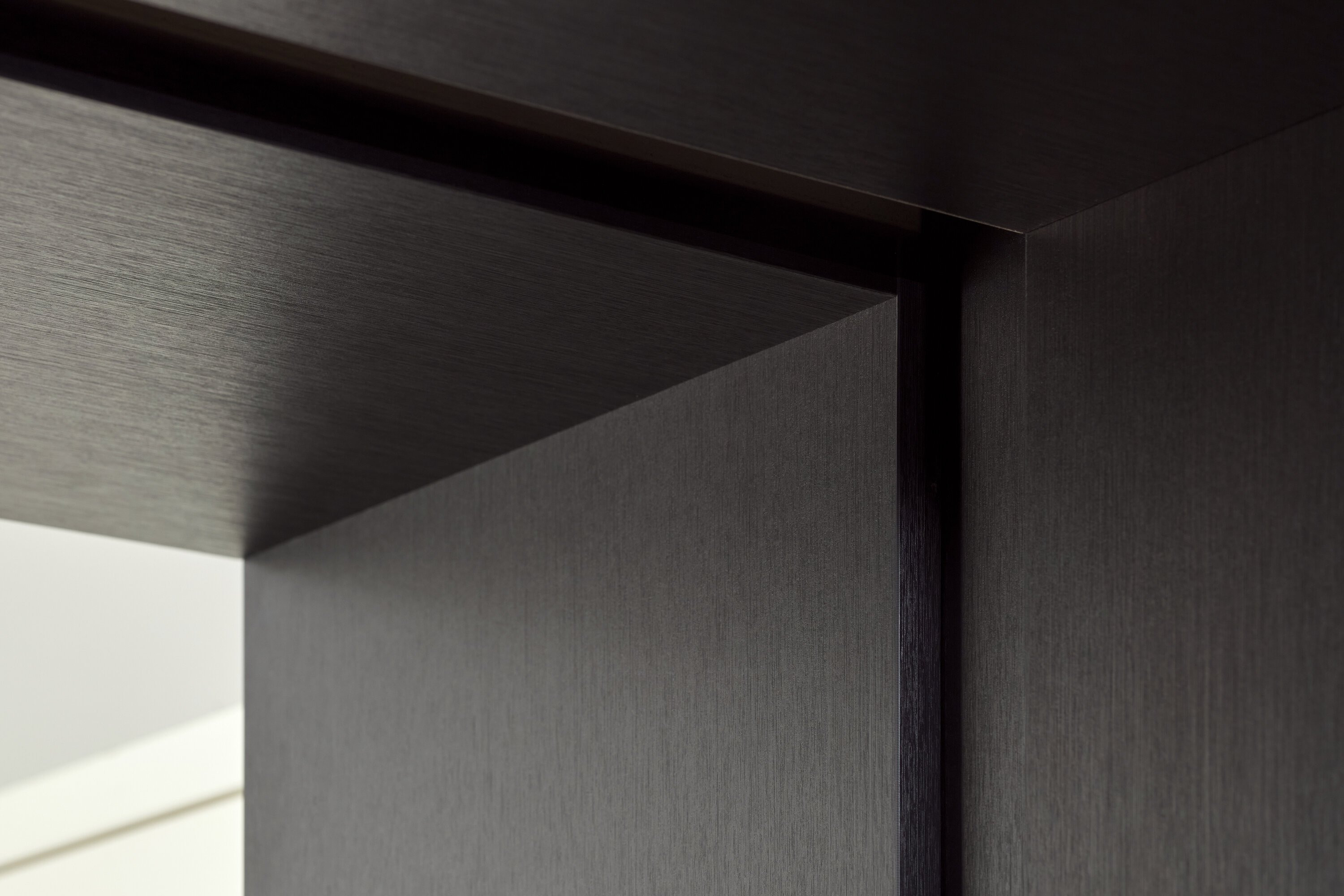 Van deze wandmeubel maakte ik detailfoto's voor de meubelmaker. De kast is geplaatst in de woon- en eetkamer en staat tegen de oude buitenwand nadat de woning is uitgebouwd. Er is gekozen voor donker grijs met een subtiele houtnerf.