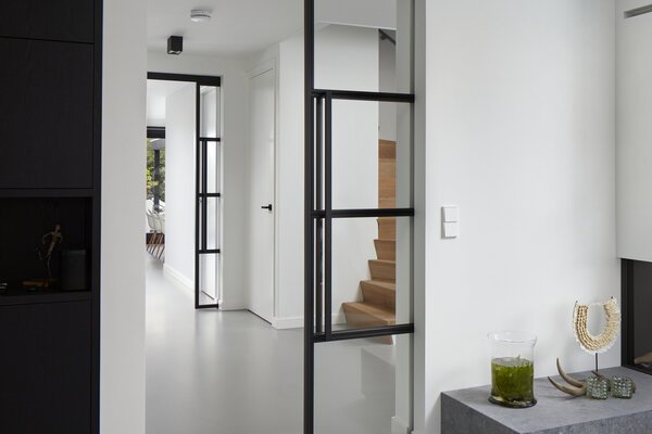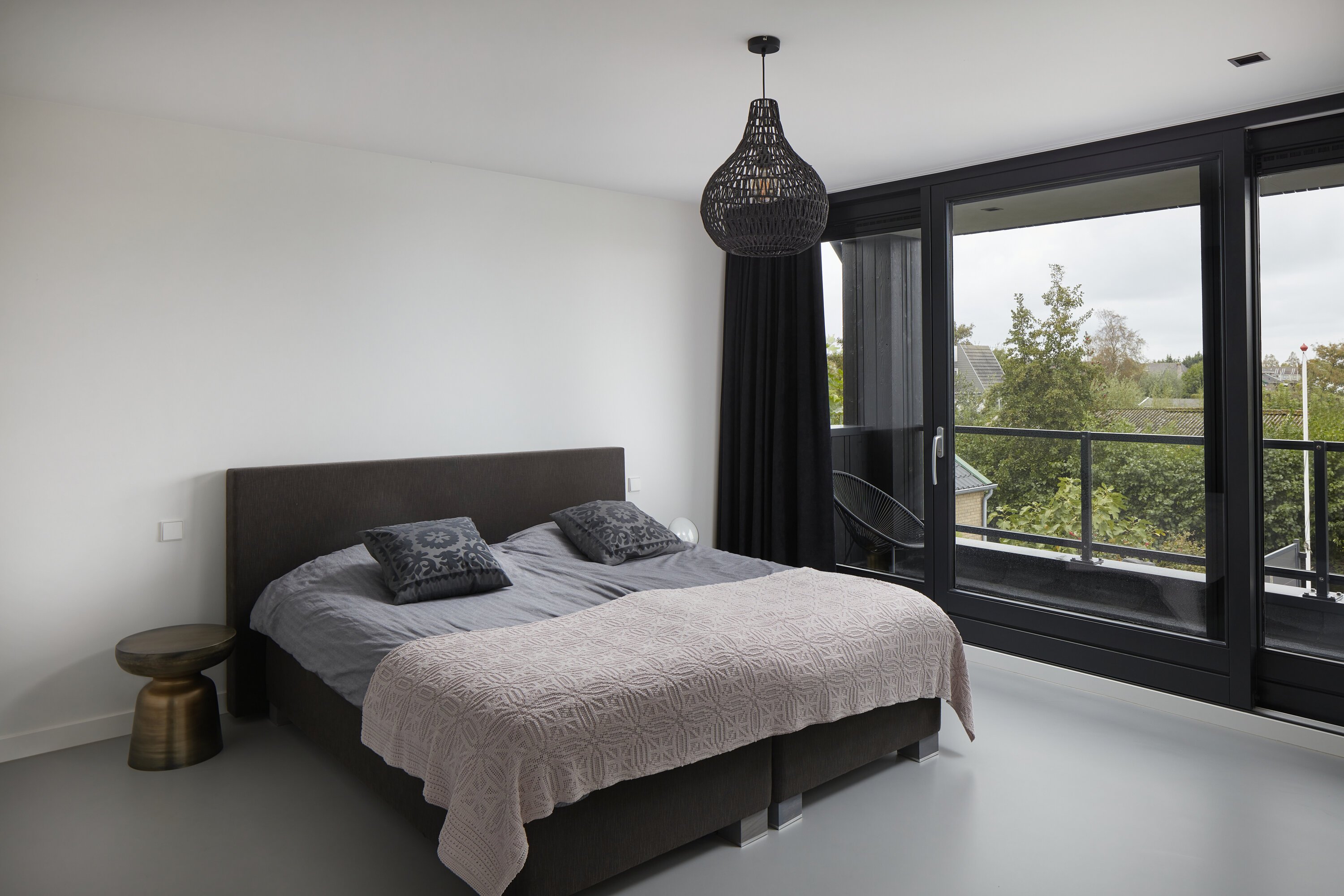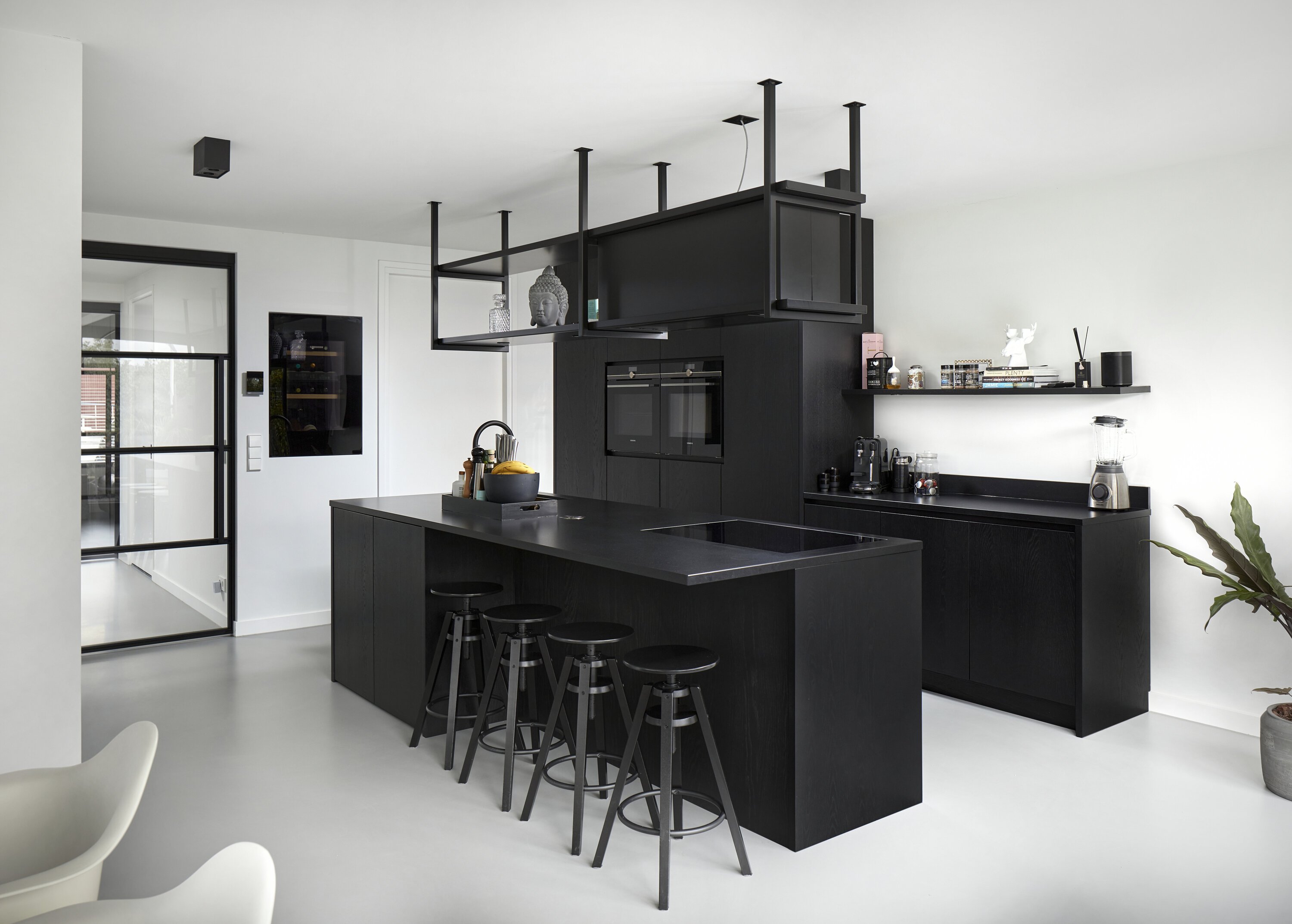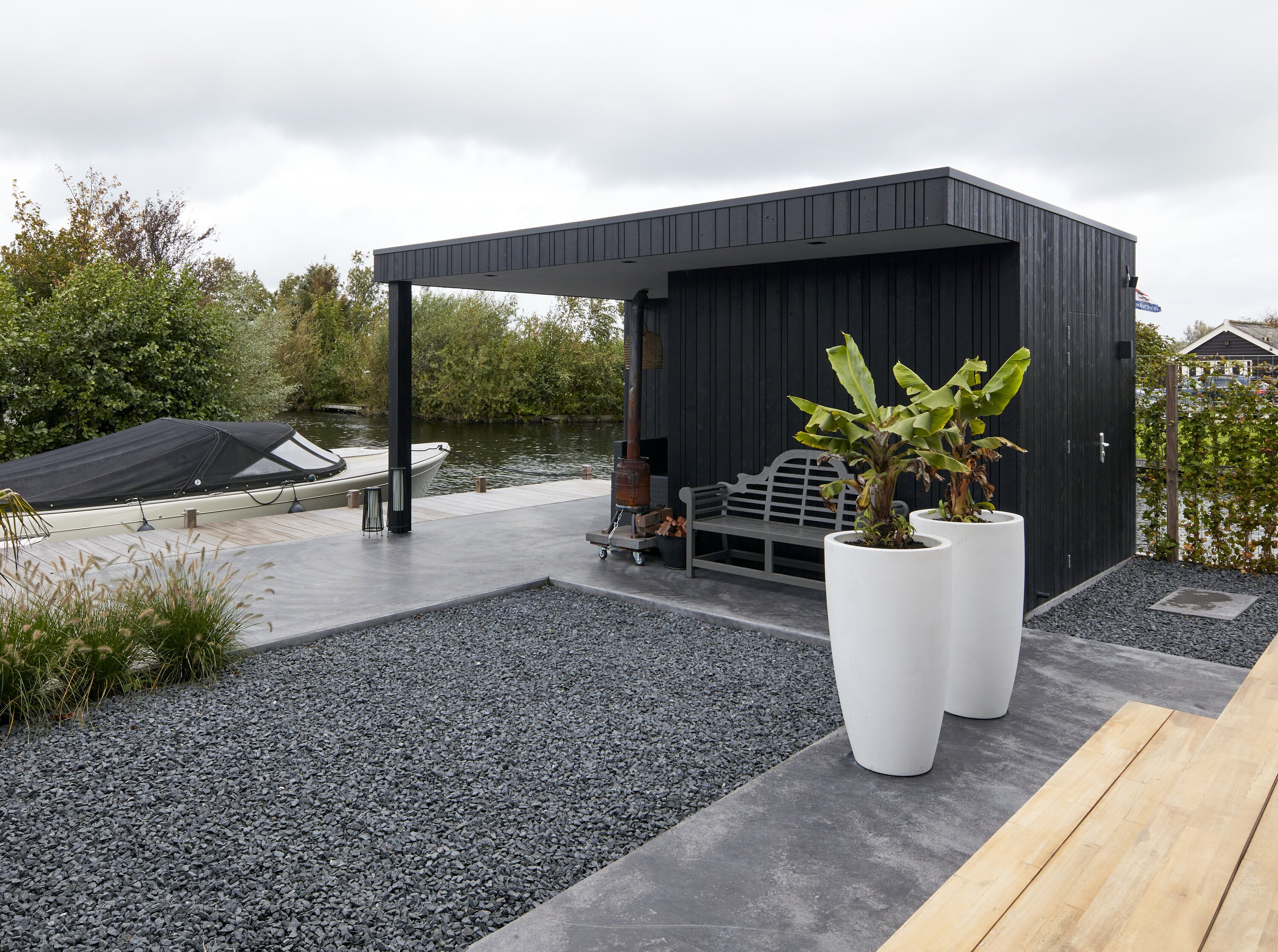 Het tweelaagse volume aan de achterzijde van de woning is aan de buitenkant voorzien van zwart houten delen. Hierdoor krijgt het geheel een stoer uiterlijk. Dit ligt geheel in lijn met de berg- en loungeruimte.