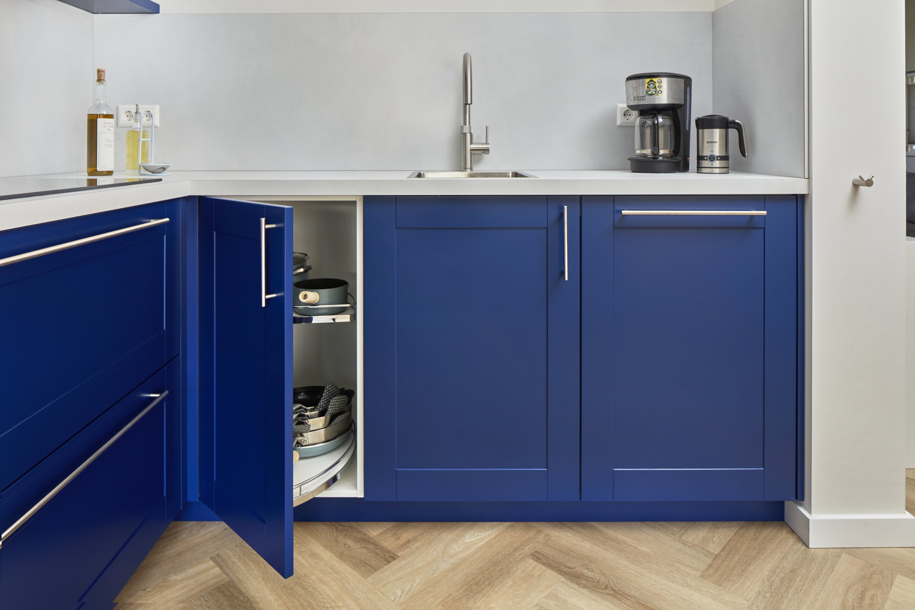 Deze op maat ontworpen keuken valt zeker op door het frisse kleurgebruik. Het blauw van de keuken complementeert goed de andere kleuren.