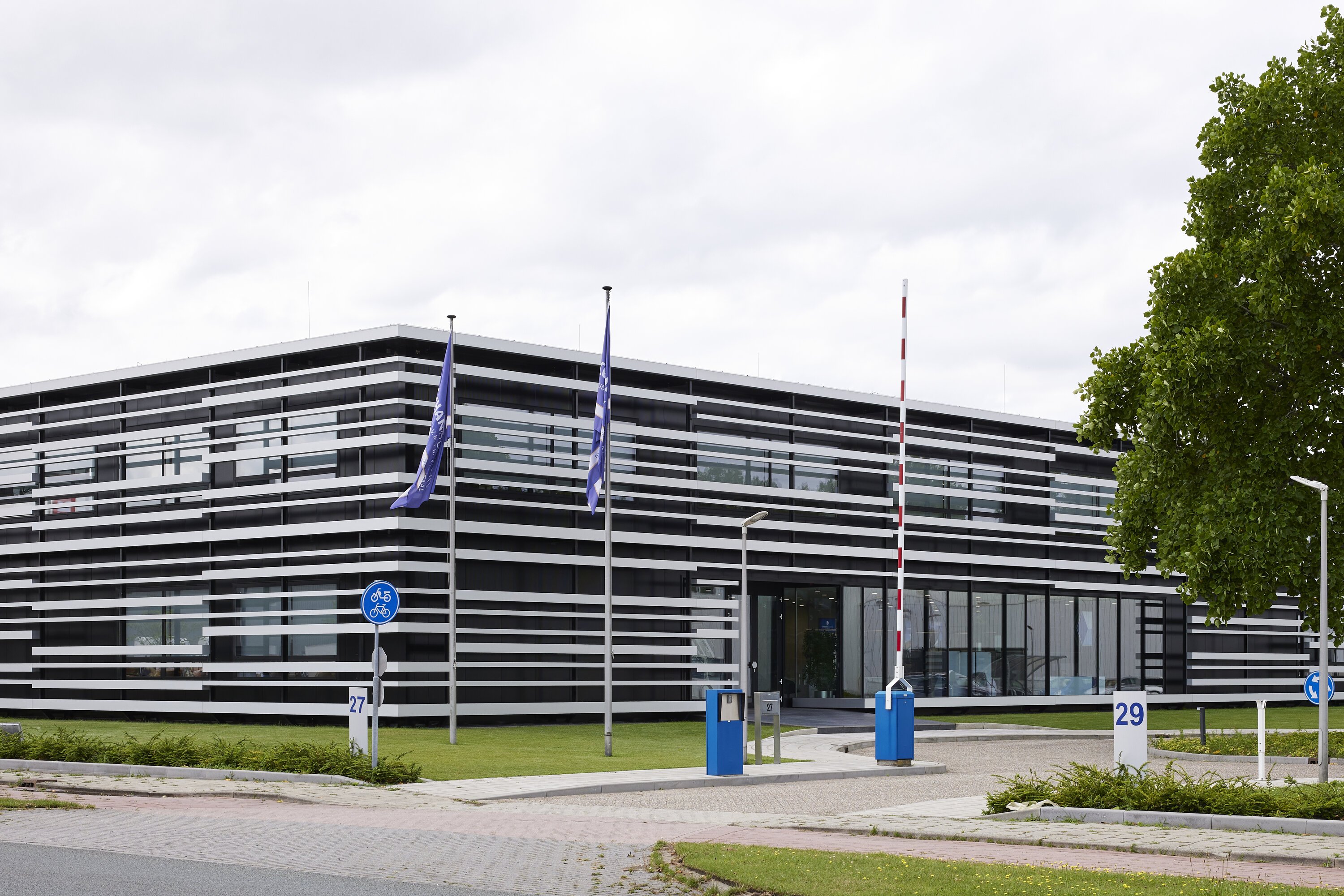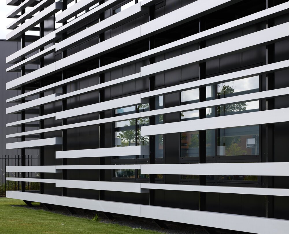 Op een speelse manier is de gevel van dit pand bekleed met aluminium profielen. Deze profielen worden gefabriceerd door Comhan Holland zelf, en hoe kun je potentiële klanten het beste inspireren? Door een fantastisch voorbeeld te laten zien van hoe je de profielen kunt gebruiken in bijvoorbeeld gevelbekleding.