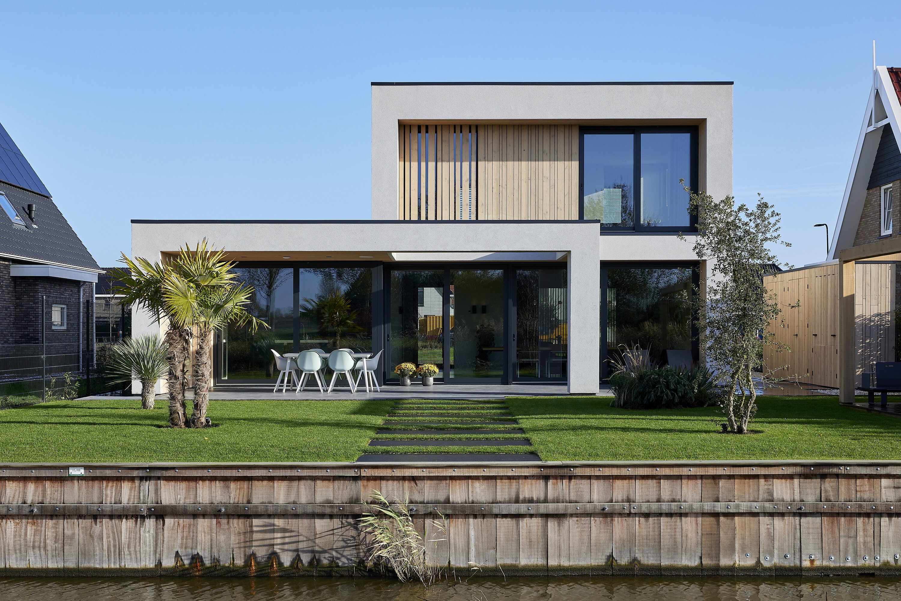 Het moderne ontwerp van deze nieuw gebouwde villa met licht interieur sluit naadloos aan op het landschap van de directe omgeving. De houten gevelbekleding in combinatie met het gebruik van hout in het interieur complementeren elkaar op een natuurlijke manier.