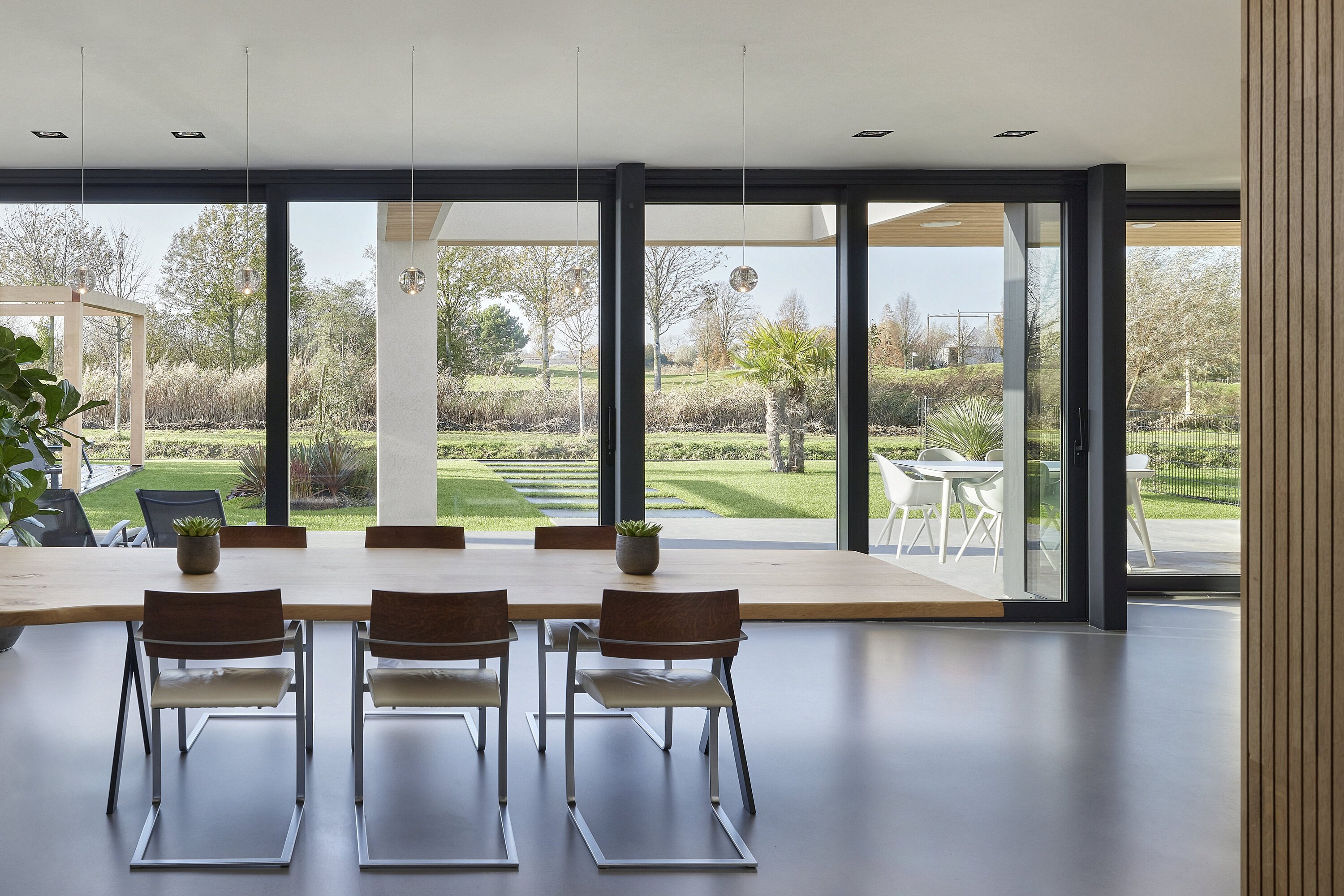 Met duidelijke zichtlijnen naar de voor- en achterzijde van de kavel vervagen grote ramen de grens tussen binnen en buiten. Het overkapte terras verkleint deze grens nog eens extra.