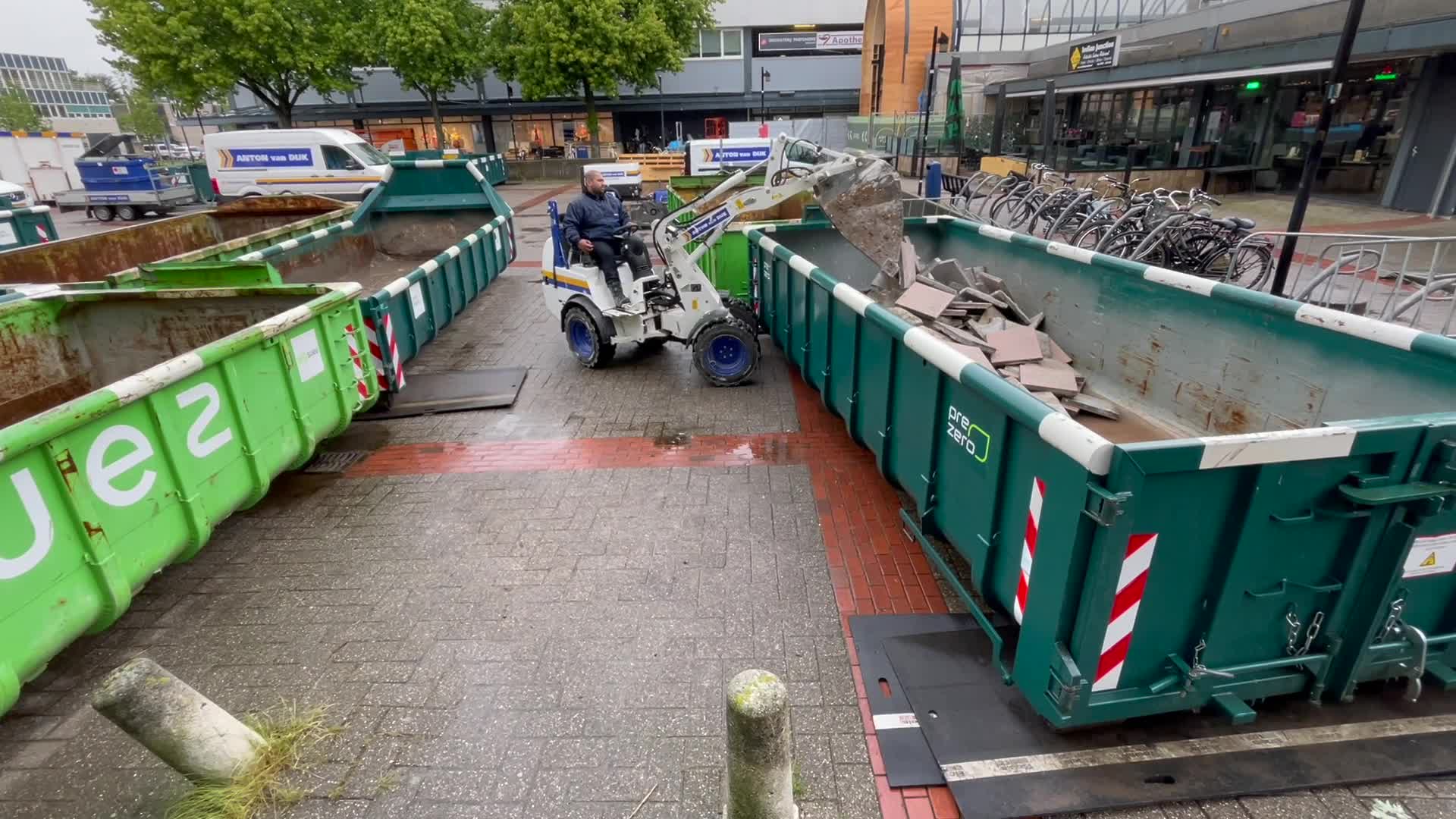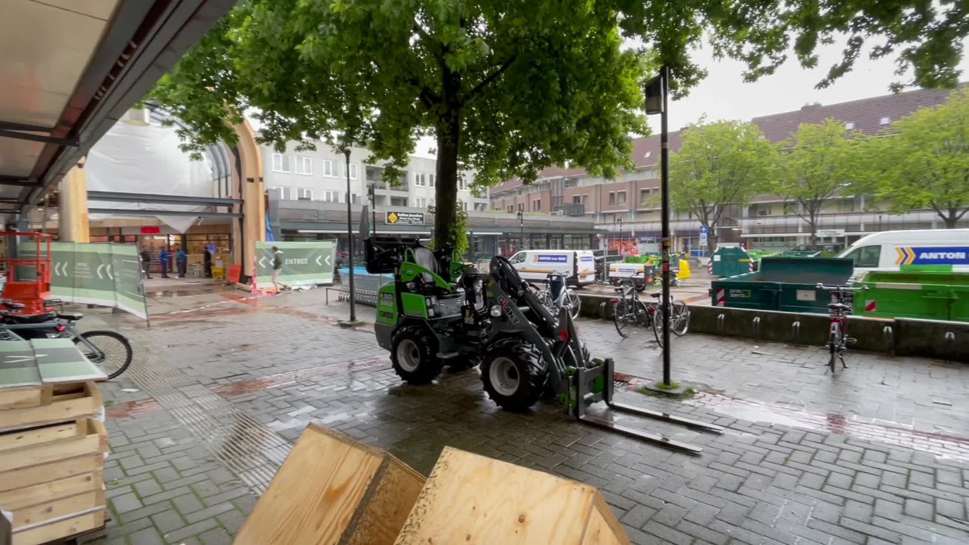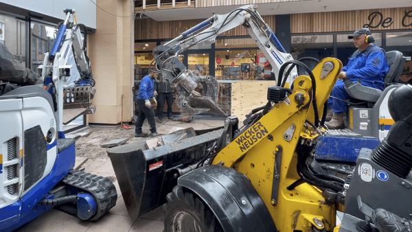 Het is ongewoon wanneer je een Bobcat of Mini shovel het winkelcentrum ziet binnenrijden. Dit deed Michel en ik op het laatste moment doen besluiten om enkele opnames van de laatste voorbereidingen te filmen met onze iPhones. We bedachten dat dit een mooie opening van de montage zou kunnen zijn en niets bleek minder waar.