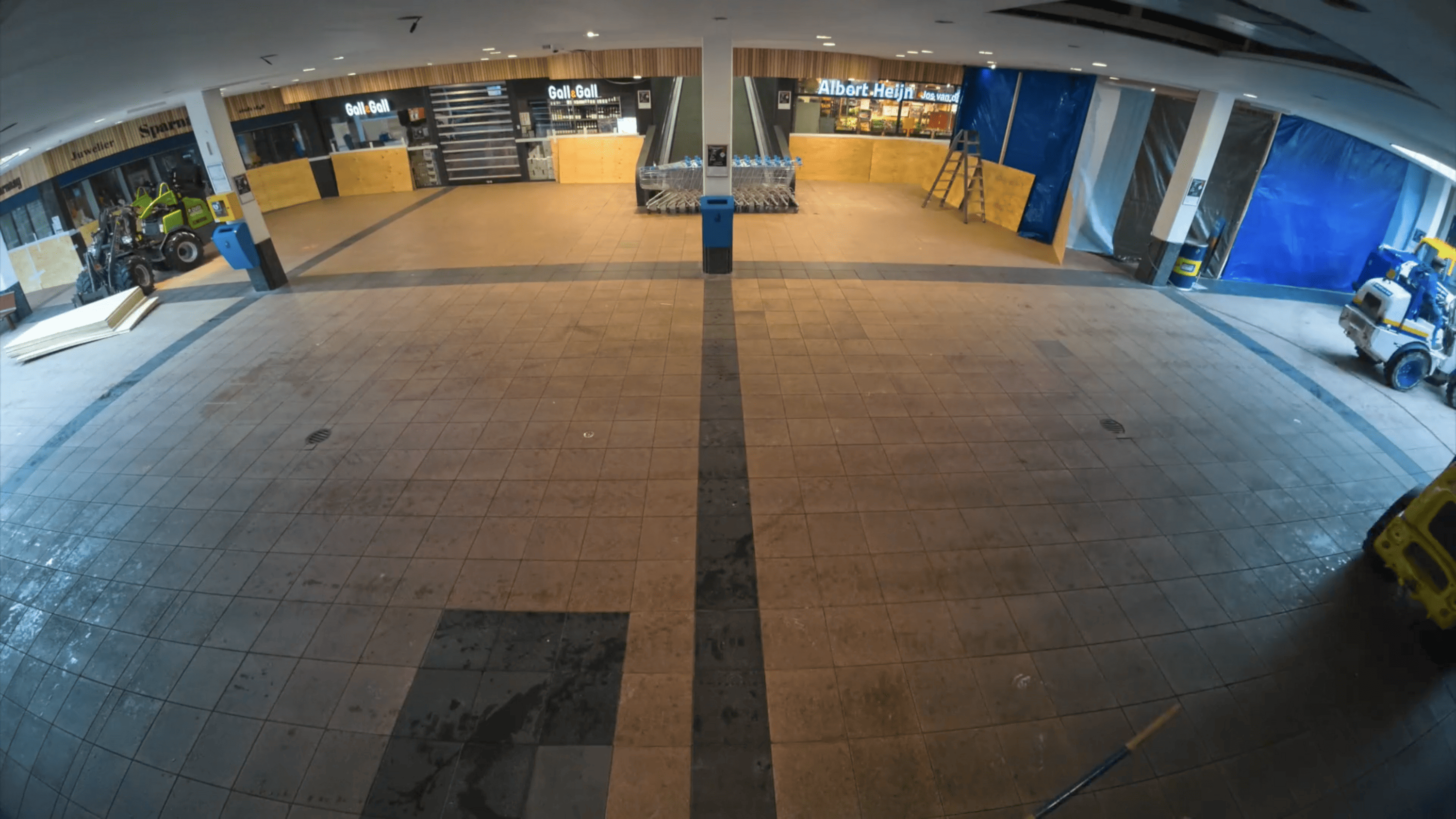 De camera plaatsten we daarom centraal in het winkelcentrum aan een de Zuidzijde. Gericht naar de Noordzijde konden we goed alle werkzaamheden vastleggen welke begonnen aan de Oostzijde (rechts in beeld) en gestaag vorderden richting de Westzijde van het winkelcentrum. Alle actie vanaf één standpunt. Deze avond kreeg Anton van Dijk uit Woerden de hoofdrol. Met een grote ploeg medewerkers en veel imposant materieel werd binnen een nacht de hele vloer van het winkelcentrum gesloopt en afgevoerd. Het werd flink stoffig, maar ook dat werd netjes opgeruimd voor de winkeliers en het publiek de volgende ochtend.