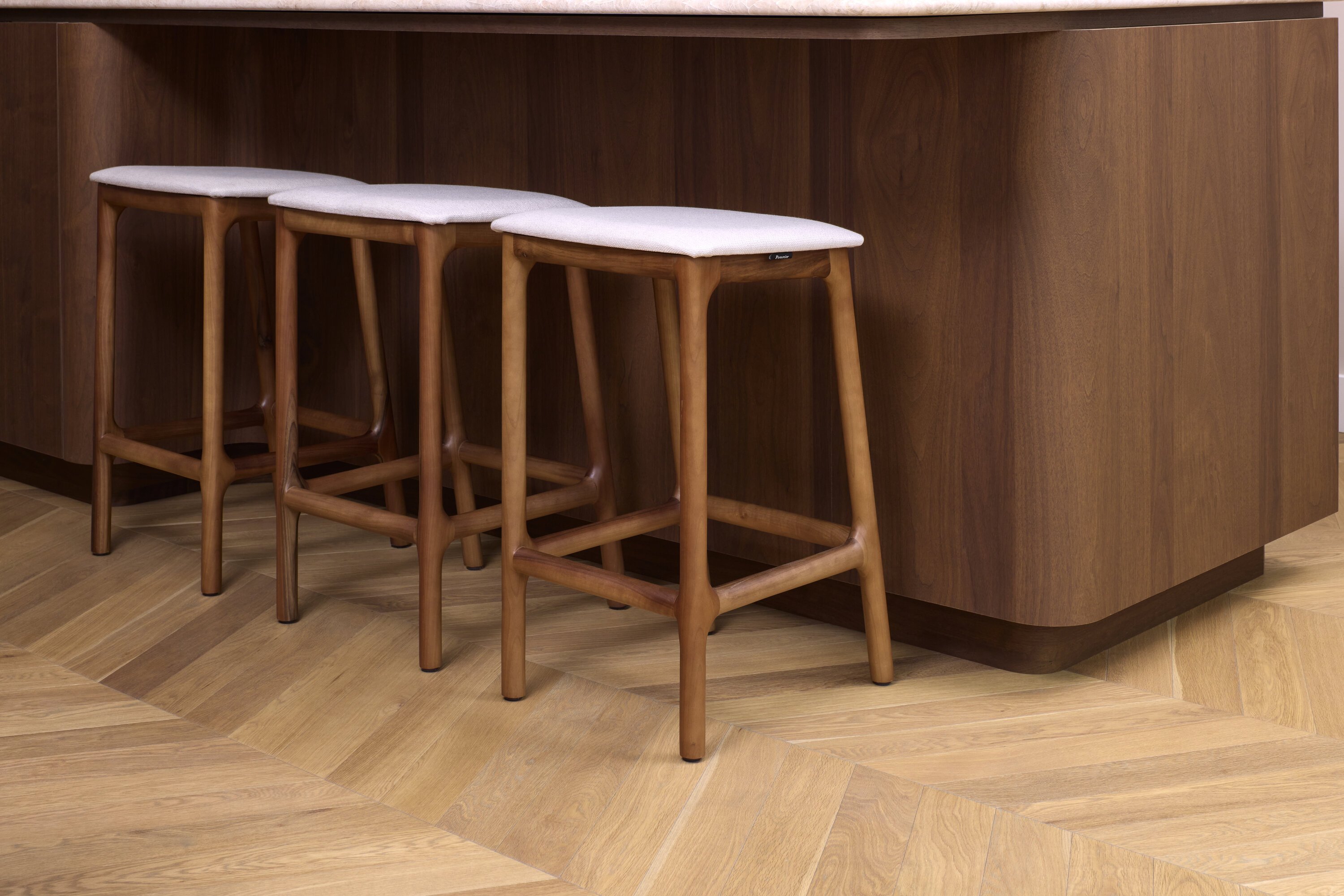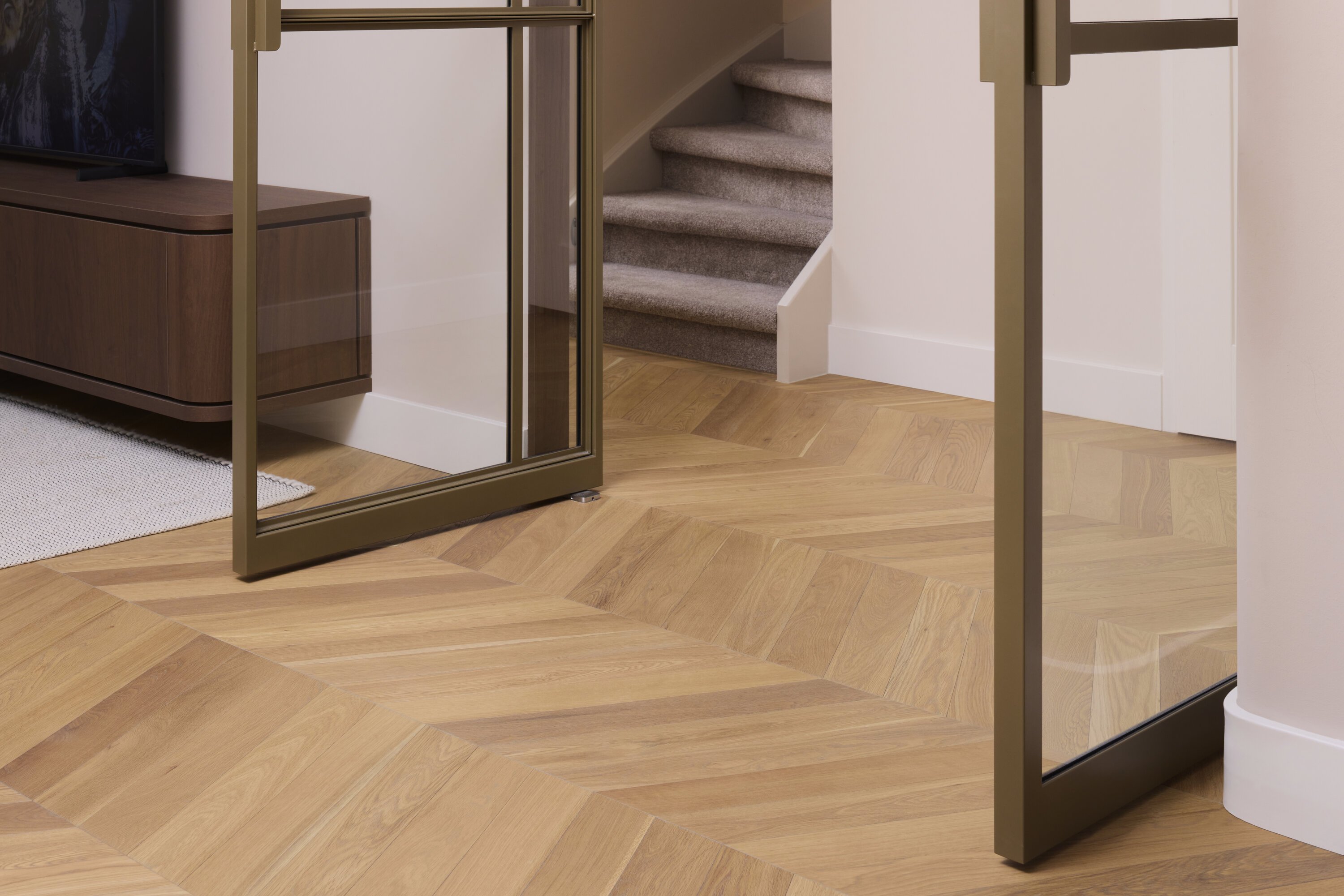 In deze woning vormt de vloer een duidelijke basis voor het interieur. De eiken vloer in Hongaarse punt brengt ritme en karakter in de ruimte, terwijl de warme houttinten mooi aansluiten op de rest van het interieur. De gestoffeerde trap voegt zachtheid toe en versterkt de rustige, verzorgde uitstraling van het geheel.